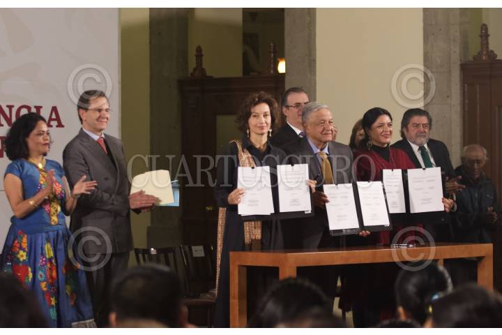 CIUDAD DE MÉXICO, 27FEBRERO2020.- Andrés Manuel López Obrador, presidente de México, encabezó la Presentación del evento de alto nivel Construyendo un Decenio de Acciones para las Lenguas Indígenas, lo acompañaron, Adelfo Regino Montes, director general del Instituto Nacional de los Pueblos Indígenas (INPI); Natalia Toledo Paz, subsecretaria de Diversidad Cultural, Secretaría de Cultura; Esteban Moctezuma Barragán, secretario de Educación Pública; Audrey Azoulay, directora general de la Organización de las Naciones Unidas para la Educación, la Ciencia y la Cultura (Unesco); Alejandra Frausto Guerrero, secretaria de Cultura; Marcelo Ebrard Casaubon, secretario de Relaciones Exteriores; Martha Delgado Peralta, subsecretaria para Asuntos Multilaterales y Derechos Humanos de la Secretaría de Relaciones Exteriores; Rogelio Jiménez Pons, director general del Fondo Nacional de Fomento al Turismo (Fonatur) y Cipriano Ramírez, tercer hablante de ixteco. FOTO: ANDREA MURCIA /CUARTOSCURO.COM
