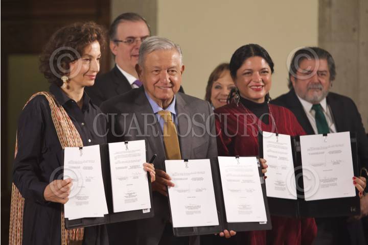 CIUDAD DE MÉXICO, 27FEBRERO2020.- Andrés Manuel López Obrador, presidente de México, encabezó la Presentación del evento de alto nivel Construyendo un Decenio de Acciones para las Lenguas Indígenas, lo acompañaron, Adelfo Regino Montes, director general del Instituto Nacional de los Pueblos Indígenas (INPI); Natalia Toledo Paz, subsecretaria de Diversidad Cultural, Secretaría de Cultura; Esteban Moctezuma Barragán, secretario de Educación Pública; Audrey Azoulay, directora general de la Organización de las Naciones Unidas para la Educación, la Ciencia y la Cultura (Unesco); Alejandra Frausto Guerrero, secretaria de Cultura; Marcelo Ebrard Casaubon, secretario de Relaciones Exteriores; Martha Delgado Peralta, subsecretaria para Asuntos Multilaterales y Derechos Humanos de la Secretaría de Relaciones Exteriores; Rogelio Jiménez Pons, director general del Fondo Nacional de Fomento al Turismo (Fonatur) y Cipriano Ramírez, tercer hablante de ixteco. FOTO: ANDREA MURCIA /CUARTOSCURO.COM