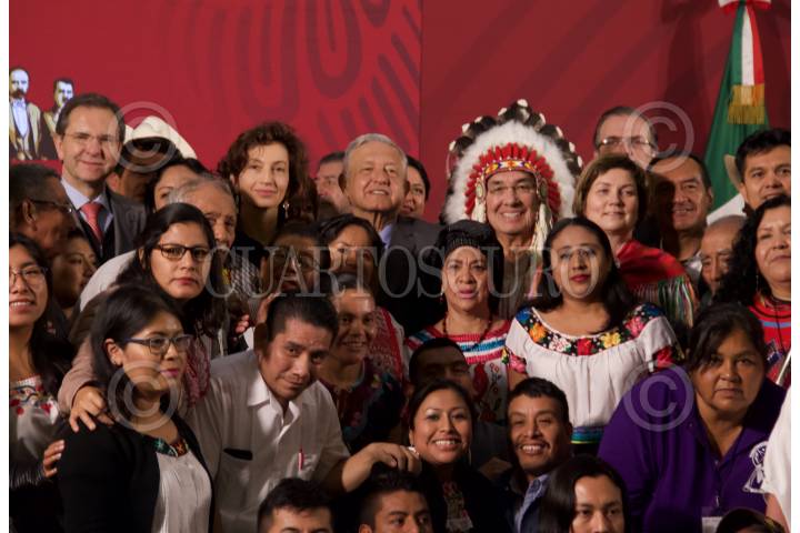 CIUDAD DE MÉXICO, 27FEBRERO2020.- Andrés Manuel López Obrador, presidente de México, encabezó la Presentación del evento de alto nivel Construyendo un Decenio de Acciones para las Lenguas Indígenas, lo acompañaron, Adelfo Regino Montes, director general del Instituto Nacional de los Pueblos Indígenas (INPI); Natalia Toledo Paz, subsecretaria de Diversidad Cultural, Secretaría de Cultura; Esteban Moctezuma Barragán, secretario de Educación Pública; Audrey Azoulay, directora general de la Organización de las Naciones Unidas para la Educación, la Ciencia y la Cultura (Unesco); Alejandra Frausto Guerrero, secretaria de Cultura; Marcelo Ebrard Casaubon, secretario de Relaciones Exteriores; Martha Delgado Peralta, subsecretaria para Asuntos Multilaterales y Derechos Humanos de la Secretaría de Relaciones Exteriores; Rogelio Jiménez Pons, director general del Fondo Nacional de Fomento al Turismo (Fonatur) y Cipriano Ramírez, tercer hablante de ixteco. FOTO: ANDREA MURCIA /CUARTOSCURO.COM