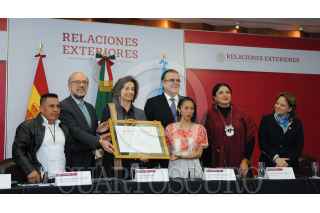 CIUDAD DE MÉXICO, 27FEBRERO2020.- La secretaria de Cultura Alejandra Frausto, el canciller Marcelo Ebrard Casaubon y Audrey Azoulay, directora general de la UNESCO, hicieron entrega del Certificado de Registro Binacional (México/España) del “Proceso de Fabricación de la Cerámica de Talavera como Patrimonio Cultural Inmaterial de la Humanidad”. FOTO: INAH /CUARTOSCURO.COM