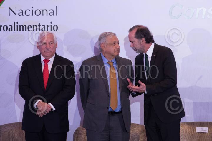 CIUDAD DE MÉXICO, 27FEBRERO2020.- Víctor Manuel Villalobos Arámbula, secretario de Agricultura y Desarrollo Rural de México (SADER); Andrés Manuel Lóepz Obrador, presidente de México, y Bosco de la Vega, presidente del Consejo Nacional Agropecuario (CNA), encabezaron la clausura de la XXXVI Asamblea General Ordinaria del Consejo Nacional Agripecuario (CNA), en el que entregaron diferentes premios. El acto se realizó en un hotel de avenida Polanco. FOTO: GRACIELA LÓPEZ /CUARTOSCURO.COM