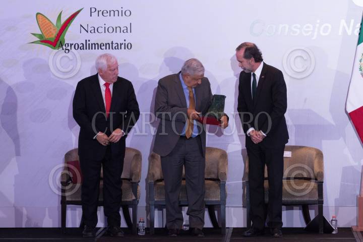 CIUDAD DE MÉXICO, 27FEBRERO2020.- Víctor Manuel Villalobos Arámbula, secretario de Agricultura y Desarrollo Rural de México (SADER); Andrés Manuel Lóepz Obrador, presidente de México, y Bosco de la Vega, presidente del Consejo Nacional Agropecuario (CNA), encabezaron la clausura de la XXXVI Asamblea General Ordinaria del Consejo Nacional Agripecuario (CNA), en el que entregaron diferentes premios. El acto se realizó en un hotel de avenida Polanco. FOTO: GRACIELA LÓPEZ /CUARTOSCURO.COM