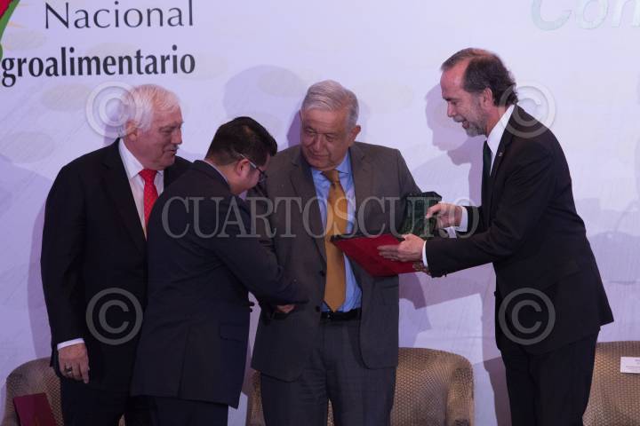 CIUDAD DE MÉXICO, 27FEBRERO2020.- Víctor Manuel Villalobos Arámbula, secretario de Agricultura y Desarrollo Rural de México (SADER); Andrés Manuel Lóepz Obrador, presidente de México, y Bosco de la Vega, presidente del Consejo Nacional Agropecuario (CNA), encabezaron la clausura de la XXXVI Asamblea General Ordinaria del Consejo Nacional Agripecuario (CNA), en el que entregaron diferentes premios. El acto se realizó en un hotel de avenida Polanco. FOTO: GRACIELA LÓPEZ /CUARTOSCURO.COM