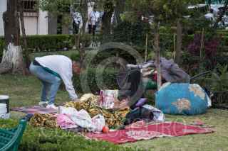 CIUDAD DE MÉXICO, 27FEBRERO2020.- Mujer en situación vulnerable lee una revista de espectáculos, acostada en medio de un área verde, rodeada de cobijas y montones de ropa, esto frente la alcaldía Cuauhtémoc. FOTO: ROGELIO MORALES /CUARTOSCURO.COM