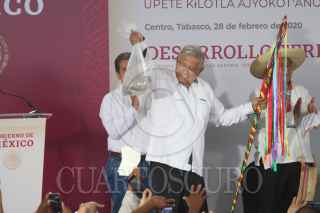 CENTRO, TABASCO, 28FEBRERO2020.- Andrés Manuel López Obrador, presidente de México, fue recibido por habitantes indígenas en la Villa Tamulte de las Sabanas, donde realizó la presentación del Programa de Mejoramiento Urbano y Diálogo con el Pueblo Yokot’an de Tabasco. En el acto es acompañado por comitiva del gobierno federal y el gobernador Adán Augusto López Hernández. FOTO: EDGAR JASSO/CUARTOSCURO.COM