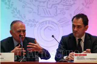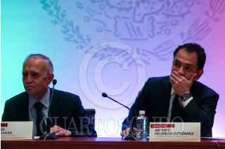CIUDAD DE MÉXICO, 03MARZO2020.- Alfonso Romo, jefe de la oficina de la Presidencia junto con Arturo Herrera, secretario de Hacienda y Crédito Público, encabezaron la conferencia de prensa para anunciar los cambias correspondientes a la llegada de Carlos Noriega Romero, nuevo titular de Banco Nacional de Comercio Exterior (Bancomext), así como de Juan Pablo Graf Noriega (Comisión Nacional Bancaria y de Valores (CNVB). FOTO: GALO CAÑAS /CUARTOSCURO.COM