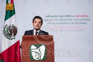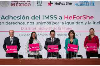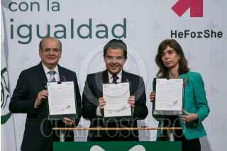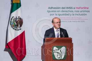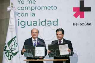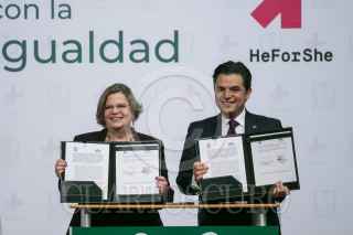 CIUDAD DE MÉXICO, 05MARZO2020.- Zoe Robledo, titular del Instituto Mexicano del Seguro Social, encabezó la firma de adhesión de dicho instituto al programa HeForShe, campaña solidaria que promueve la equidad de género, creada por ONU Mujeres, esta provee una aproximación sistemática y una plataforma para eliminar las brechas de desigualdad en distintos niveles. A su vez, el titular del IMSS firmó acuerdos entre el Consejo Nacional para Prevenir la Discriminación (COPRED); el Instituto Nacional de las Mujeres (INMUJERES), la ONU Mujeres, y el sindicato de trabajadores del IMSS para erradicar el acoso, la violencia y la discriminación dentro de la institución. FOTO: GALO CAÑAS /CUARTOSCURO.COM