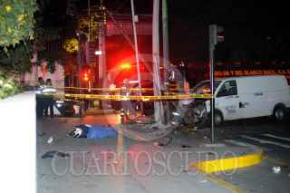 Ciudad de México, 09 marzo 2020. Un hombre de aproximadamente 35 años que viajaba a bordo de una motocicleta, perdió la vida al ser impactado por camioneta tipo Urban en el cruce de avenida Mariano Escobedo y Laguna Mayran en la colonia Anáhuac. Dicha camioneta termino impactada contra un poste en el mismo lugar. Foto: Luis Carbayo/cuartoscuro.com