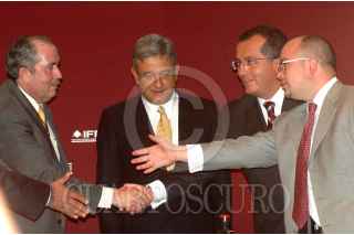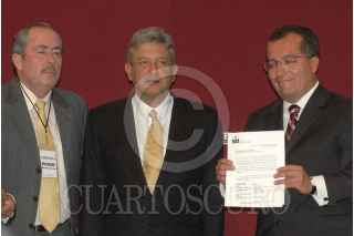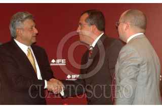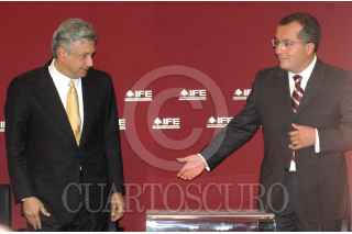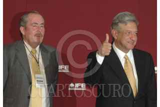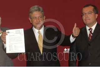 MÉXICO, D.F. 08ENERO2006.- Andrés Manuel López Obrador recibió la constancia del IFE al registrarse como candidato oficial del Partido de la Revolución Democrática (PRD) a la presidencia de la república de manos del consejero presidente del Instituto Federal Electoral (IFE) Luis Carlos Ugalde. FOTO: Iván Stephens/CUARTOSCURO.COM