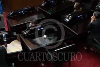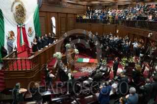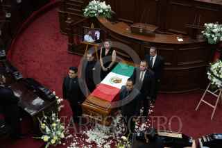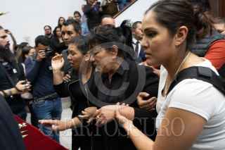 MORELIA, MICHOACÁN, 10MARZO2020. Congreso de Michoacán da último adiós al diputado Erik Juárez Blanquet. El homicidio del diputado Erik es un atentado contra la soberanía, expresó la diputada Miriam Tinoco Soto a nombre de la Septuagésima Cuarta Legislatura, durante la ceremonia luctuosa que se le brindó al oriundo de Angamacutiro, asesinado este martes 10 de marzo, en la cuidad Morelia. El cuerpo del diputado que con 39 años ya había encabezado una presidencia municipal, así como una diputación federal, estuvo por última ocasión en el salón de Pleno, entre aplausos y minutos de silencio, Erik fue despedido. A nombre de la familia Juárez Blanquet, su hermana, Maribel, hizo uso del estrado para exigir que la justicia no esté del lado de los malos sino de los buenos y se aclare la muerte de quien dijo, era el sostén de la familia. FOTO: JUAN JOSÉ ESTRADA SERAFÍN /CUARTOSCURO.COM