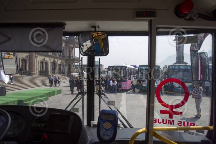 MONTERREY, NUEVO LEÓN, 13MARZO2020.- Diversas empresas de transporte urbano iniciaron una campaña contra el acoso en el transporte público con botones de pánico el cual las mujeres que sufran algún tipo de acoso podrán presionar el botón de pánico el cuál provocará que suene una alarma con luz de emergencia, el operador tiene la obligación de cerrar las puertas y llamar a las autoridades correspondientes. FOTO: GABRIELA PÉREZ MONTIEL / CUARTOSCURO.COM