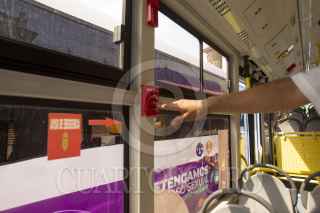 MONTERREY, NUEVO LEÓN, 13MARZO2020.- Diversas empresas de transporte urbano iniciaron una campaña contra el acoso en el transporte público con botones de pánico el cual las mujeres que sufran algún tipo de acoso podrán presionar el botón de pánico el cuál provocará que suene una alarma con luz de emergencia, el operador tiene la obligación de cerrar las puertas y llamar a las autoridades correspondientes. FOTO: GABRIELA PÉREZ MONTIEL / CUARTOSCURO.COM