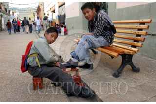 SAN CRISTOBAL DE LAS CASAS, CHIAPAS 09ENERO2006.- Un niño Bolero le lustra los zapatos a otro del mismo oficio. FOTO: Moysés Zúñiga/CUARTOSCURO.COM