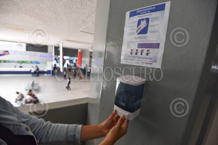 La Terminal de Autobuses de Toluca incrementó sus medidas de higiene colocando en varios puntos gel antibacterial y letreros de información del Coronavirus, y se prevé que en los siguientes días se reduzca de manera considerable el uso del transporte foráneo en comparación a días normales hasta en un 60 por ciento. FOTO: CRISANTA ESPINOSA AGUILAR /CUARTOSCURO.COM