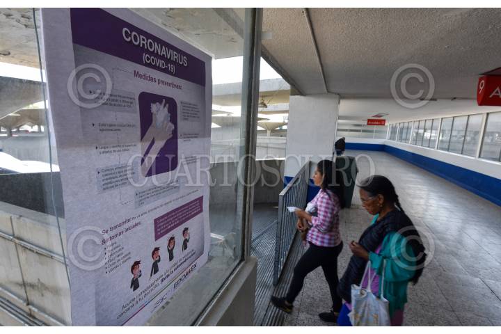 La Terminal de Autobuses de Toluca incrementó sus medidas de higiene colocando en varios puntos gel antibacterial y letreros de información del Coronavirus, y se prevé que en los siguientes días se reduzca de manera considerable el uso del transporte foráneo en comparación a días normales hasta en un 60 por ciento. FOTO: CRISANTA ESPINOSA AGUILAR /CUARTOSCURO.COM