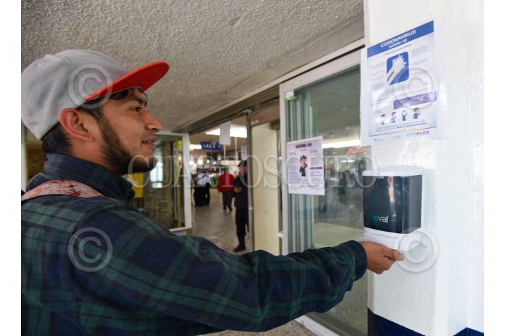 La Terminal de Autobuses de Toluca incrementó sus medidas de higiene colocando en varios puntos gel antibacterial y letreros de información del Coronavirus, y se prevé que en los siguientes días se reduzca de manera considerable el uso del transporte foráneo en comparación a días normales hasta en un 60 por ciento. FOTO: CRISANTA ESPINOSA AGUILAR /CUARTOSCURO.COM