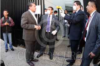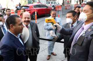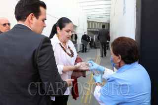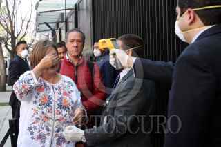 CIUDAD DE MÉXICO, 17MARZO2020.- La senadora Xóchitl Gálvez es revisada con el termómetro digital antes de entrar al Senado de la República como medida preventiva para detectar personas con síntomas de Covid-19, y así evitar su propagación. FOTO: CUARTOSCURO.COM