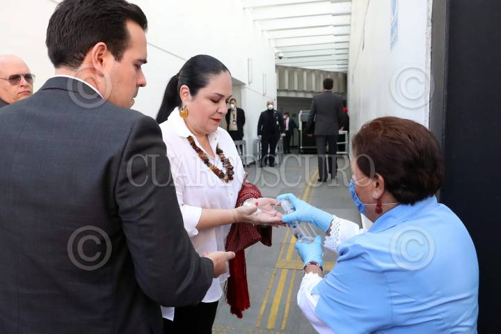 CIUDAD DE MÉXICO, 17MARZO2020.- La senadora Xóchitl Gálvez es revisada con el termómetro digital antes de entrar al Senado de la República como medida preventiva para detectar personas con síntomas de Covid-19, y así evitar su propagación. FOTO: CUARTOSCURO.COM