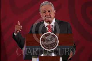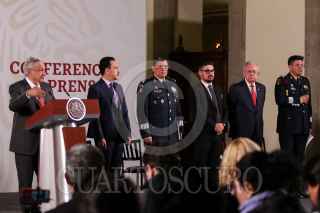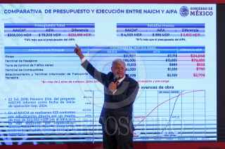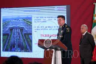 CIUDAD DE MÉXICO, 18MARZO2020.- Conferencia de prensa del presidente Andrés Manuel López Obrador para dar detalles de los avances en la construcción del Aeropuerto Internacional de Santa Lucía. Los pormenores fueron explicados por Gustavo Ricardo Vallejo Suárez, ingeniero residente general y Comandante del Agrupamiento de Ingenieros en la Base Aérea de Santa Lucía, donde estableció que el tope presupuestas es de 79, 305 millones de pesos, así como las conexiones interurbanas que se gestionan en la construcción. El evento contó con la presencia de Omar Fayad, gobernador de Hidalgo; Luis Cresencio Sandoval, secretario de la Defensa Nacional, y Javier Jiménez Espriú, secretario de Comunicaciones y Transportes. FOTO: GALO CAÑAS /CUARTOSCURO.COM