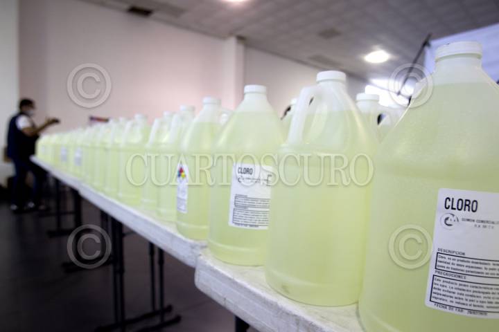 GUADALUPE, NUEVO LEÓN, 18MARZO2020.- Voluntarios realizan envasado de gel antibacterial y cloro que será repartido entre la ciudadanía de manera gratuita ante el incremento de casos de coronavirus en Nuevo León. FOTO: GABRIELA PÉREZ MONTIEL / CUARTOSCURO.COM