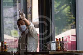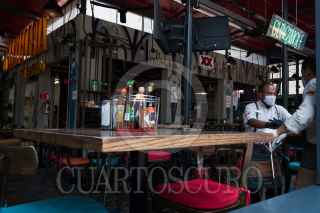 CIUDAD DE MÉXICO, 18MARZO2020.- En los comercios del centro se empieza a notar la baja clientes ante la petición de las autoridades sanitarias a la población de mantenerse en casa como una medida para evitar un posible contagio de Covid-19. El Poder Judicial de la Federación ayer anunció que pararían actividades por lo menos un mes, y las vacaciones de semana santa de educación primaria se adelantarán para el próximo lunes. En la imagen meseros con cubrebocas y guantes esperan a clientes en un restaurante. FOTO: MOISÉS PABLO/CUARTOSCURO.COM