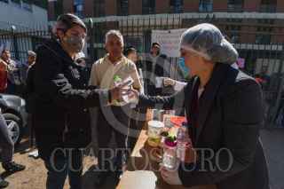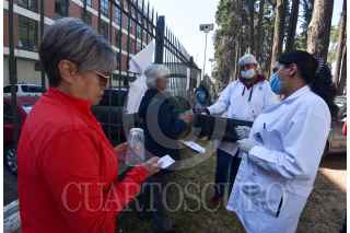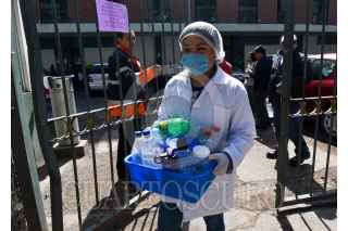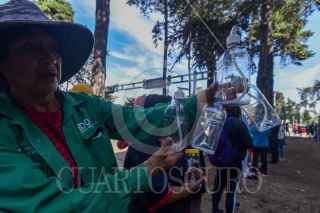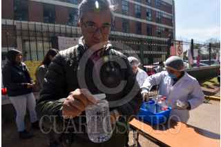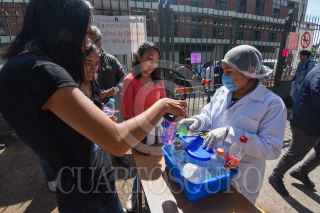 Estudiantes de la Facultad de Química de la UAEM se dieron a la tarea de fabricar gel antibacterial y darlo de forma gratuita a la población; desde temprana hora la gente llegó con sus envases vacíos a formarse y esperar su turno para que les fuera entregado el gel. Participaron estudiantes de las carreras de Química, Química Farmacéutico Biólogo, Química en Alimentos, Ingeniería Petroquímica, Ingeniería Química elaborando alrededor de 700 litros. FOTO: CRISANTA ESPINOSA AGUILAR /CUARTOSCURO.COM