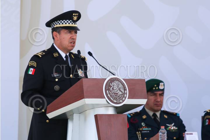 SAN MIGUEL DE LOS JAGÜEYES, ESTADO DE MÉXICO, 19MARZO2020.- El presidente Andrés Manuel López Obrador encabezó la Ceremonia de Clausura del 4º Escalón del curso de formación inicial para la integración de la Guardia Nacional. En compañía de los representantes de la SEDENA; Marina; Seguridad Pública; Gobernación, así como del comandante de la Guardia Nacional y el gobernador del Estado de México, el jefe del ejecutivo destacó la labor de las fuerzas armadas y llamó a los nuevos elementos a no aceptar “propuestas indecorosas” del crimen organizado. FOTO: GALO CAÑAS /CUARTOSCURO.COM