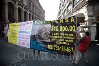 CUERNAVACA, MORELOS, 19MARZO2020.- Familiares de Ramiro Herrera Hernández, de 27 años, desaparecido el 29 de julio del 2019 en Cuautla Morelos, bloquean con una gran manta la calle Galeana en el centro de la ciudad para exigir celeridad en su caso y audiencia con el gobernador y el fiscal del estado. Denuncian irregularidades en la investigación, como es el traslado de la carpeta de investigación de Cuautla a la capital. Resaltan que ellos ofrecen 80 mil de recompensa pesos por quien informe sobre el paradero de Ramiro, y 15 mil por informes sobre la moto que manejaba y que también desapareció. FOTO: MARGARITO PÉREZ RETANA /CUARTOSCURO.COM