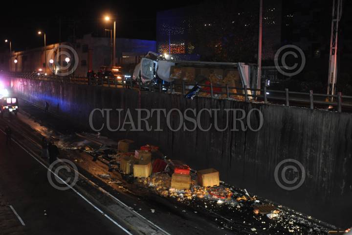 Ciudad de México, 20 marzo 2020. Un tráiler que transportaba pollo congelado volcó, al tomar el acceso de Periférico a Constituyentes a gran velocidad, recostándose sobre su costado izquierdo y regando su carga en carriles centrales de Constituyentes con dirección Toluca. Foto: Luis Carbayo/cuartoscuro.com