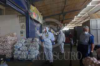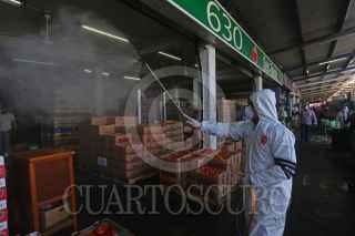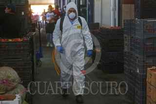 GUADALAJARA, JALISCO, 20MARZO2020.- Una cuadrilla de brigadistas de una empresa independiente contratada por la Unión de Comerciantes del Mercado de Abastos (UCMA), realizan labores de saneamiento y desinfección con Ozono contra el covid-19 en bodegas del mercado de Abastos. FOTO: FERNANDO CARRANZA GARCIA / CUARTOSCURO.COM