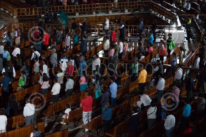CIUDAD DE MÉXICO, 22MARZO2020.- La misa de medio día encabezada por el Cardenal Carlos Aguiar en la Basílica de Guadalupe fue a puerta cerrada, aunque la misa anterior y posterior fue con público, quien fue conminado a mantener su sana distancia, en el marco de las medidas que hay que adoptar ante a propagación del Covid-19. En el intermedio de las misas gente de limpieza limpio bancas y pasamanos. Autoridades locales han anunciado que a partir del día de mañana se suspenden las liturgias, así como lugares que puedan albergar a más de 50 personas. FOTO: MOISÉS PABLO/CUARTOSCURO.COM