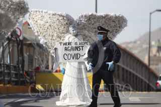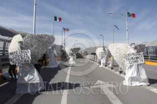CIUDAD JUÁREZ, CHIHUAHUA, 23MARZO2020.- “Ángeles mensajeros” se apostaron la tarde de este en el puente internacional Paso del Norte, también conocido como Santa Fe. Esto con la intención de emitir mensajes de aliento ante la crisis del coronavirus que se registra en todo el mundo y que orilló a Estados Unidos a cerrar parcialmente sus fronteras. “Ante pandemia, Jesucristo tiene el control” y “Ante Covid-19, Dios te guarda”, fueron algunos de los mensajes que portaron los “ángeles”. Los “ángeles mensajeros” están confirmados por una agrupación religiosa quienes llevan mensajes de paz ante los acontecimientos que se viven en la frontera. FOTO: NACHO RUIZ/CUARTOSCURO.COM