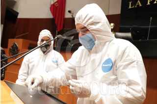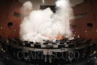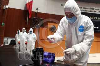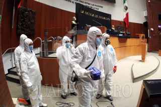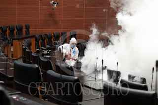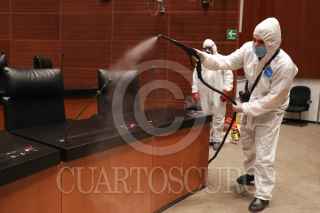 CIUDAD DE MÉXICO, 22MARZO2020.- Trabajadores especializados realizaron la sanitización del salón de sesiones del Senado de la República como parte de las medidas preventivas ante la epidemia de Covid-19. FOTO: SENADO/CUARTOSCURO.COM