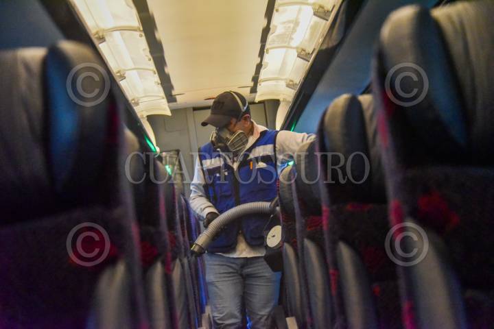 La sanitización de autobuses foráneos en la Terminal de Autobuses de Toluca se realiza por un procedimiento en donde se utiliza un aspersor y un nebulizador que se rocía en asientos y el compartimiento de maletas una fórmula a base de amonios, esto como medidas de prevención ante la pandemia de COVID-19. FOTO: CRISANTA ESPINOSA AGUILAR /CUARTOSCURO.COM