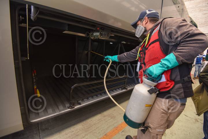 La sanitización de autobuses foráneos en la Terminal de Autobuses de Toluca se realiza por un procedimiento en donde se utiliza un aspersor y un nebulizador que se rocía en asientos y el compartimiento de maletas una fórmula a base de amonios, esto como medidas de prevención ante la pandemia de COVID-19. FOTO: CRISANTA ESPINOSA AGUILAR /CUARTOSCURO.COM