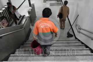 CIUDAD DE MÉXICO, 25MARZO2020.- El sistema de Transporte Colectivo metro anunció que a partir de esta semana los adultos mayores o diagnosticados con padecimientos crónicos, podrán permanecer en sus casas con goce de sueldo y sin ninguna afectación laboral, sin embargo, muchos de ellos aún se observan en las diferentes estaciones haciendo labores de limpieza. FOTO: MOISÉS PABLO/CUARTOSCURO.COM