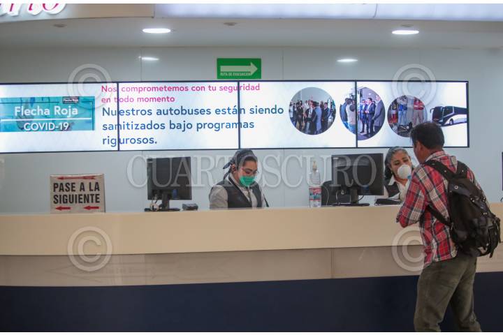 En la Terminal de autobuses de Toluca la línea Ómnibus de México informó que q partir de hoy se suspendían los servicios con destinos internacionales norte a sur y viceversa, se continúa con las medidas preventivas ante COVID-19, y con letreros en diversos puntos de informa a los usuarios acerca de las medidas sanitarias. FOTO: CRISANTA ESPINOSA AGUILAR /CUARTOSCURO.COM