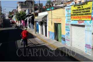 CUERNAVACA, MORELOS, 27MARZO2020.- La actividad pública en las calles de la ciudad disminuye ante la emergencia sanitaria por el COVID-19. En la imagen un anciano camina por una calle desierta del barrio de Amatitlán, a la derecha en un negocio de imprenta una manta anuncia la suspensión de labores y la entrega de pedidos a domicilio. FOTO: MARGARITO PÉREZ RETANA /CUARTOSCURO.COM