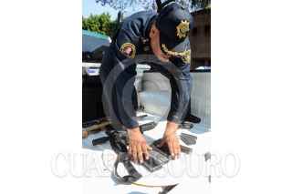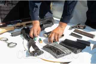 CIUDAD DE MÉXICO, 27MARZO2020.- Tres sujetos entre ellos una mujer fueron detenidos con un arsenal de armas y equipo táctico militar tras enfrentarse a balazos con elementos de la Secretaria de Seguridad Ciudadana (SSC) y llevados a la agencia 50 del Ministerio Público (MP). Uno de los detenidos fue llevado a un hospital ya que resultó herido durante el enfrentamiento, el incidente suscitó en la calle de Cabo Nueva Esperanza y Cabo Esperanza en la colonia Gabriel Hernández de la alcaldía de Gustavo A. Madero. FOTO; ARMANDO MONROY /CUARTOSCURO.COM