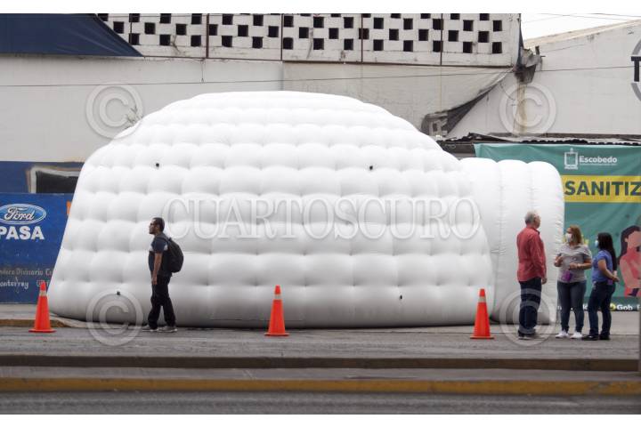 ESCOBEDO, NUEVO LEÓN, 29MARZO2020.- El primer túnel sanitizante fue colocado en la entrada de la estación del metro sendero, el cual rocía desinfectante hasta a 30 personas por minuto y puede durar hasta 12 horas en las prendas de ropa y objetos. Se tiene estimado colocar al menos tres más por diversos puntos concurridos del área metropolitana de Monterrey con un costo de 75 mil pesos cada uno. FOTO: GABRIELA PÉREZ MONTIEL / CUARTOSCURO.COM