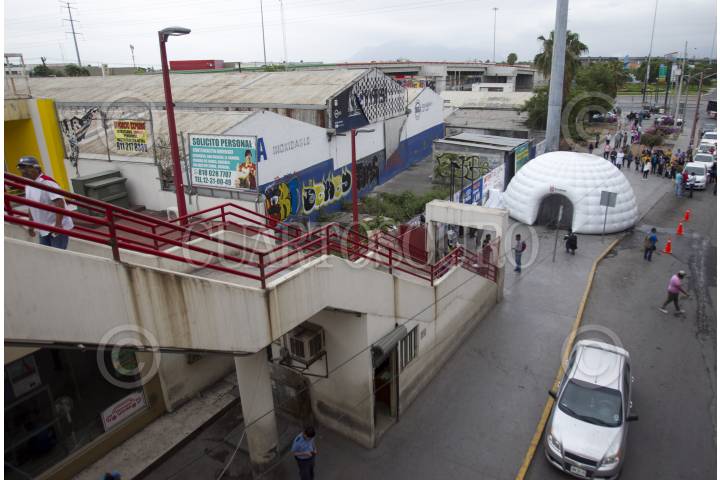 ESCOBEDO, NUEVO LEÓN, 29MARZO2020.- El primer túnel sanitizante fue colocado en la entrada de la estación del metro sendero, el cual rocía desinfectante hasta a 30 personas por minuto y puede durar hasta 12 horas en las prendas de ropa y objetos. Se tiene estimado colocar al menos tres más por diversos puntos concurridos del área metropolitana de Monterrey con un costo de 75 mil pesos cada uno. FOTO: GABRIELA PÉREZ MONTIEL / CUARTOSCURO.COM