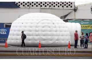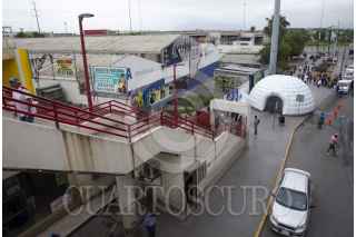 ESCOBEDO, NUEVO LEÓN, 29MARZO2020.- El primer túnel sanitizante fue colocado en la entrada de la estación del metro sendero, el cual rocía desinfectante hasta a 30 personas por minuto y puede durar hasta 12 horas en las prendas de ropa y objetos. Se tiene estimado colocar al menos tres más por diversos puntos concurridos del área metropolitana de Monterrey con un costo de 75 mil pesos cada uno. FOTO: GABRIELA PÉREZ MONTIEL / CUARTOSCURO.COM