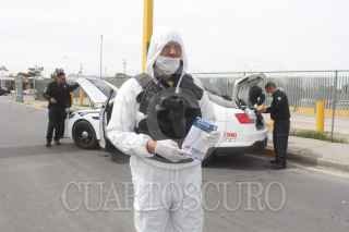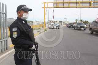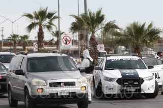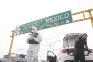 CIUDAD JUAREZ, CHIHUAHUA, 29MARZO2020.- En el marco del cerco establecido por las autoridades estatales, elementos de la Policía Vial de Chihuahua se colocaron en las afueras de los puentes internacionales para entregar folletos informativos sobre el coronavirus, a paseños que visitan nuestra frontera. Se informó que los agentes pertenecen a la Comisión Estatal de Seguridad, quienes fueron acompañados por elementos de la Policía Federal y portan equipo de protección contra la enfermedad. FOTO: NACHO RUIZ /CUARTOSCURO.COM