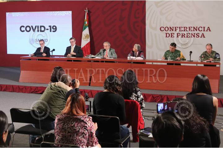 CIUDAD DE MÉXICO DE MÉXICO, 30MARZO2020.- José Rafael Ojeda Durán , Secretario de Mariana, Luis Cresencio Sandoval González, Secretario de la Defensa Nacional, Marcelo Ebrard, Secretario de Relaciones Exteriores y Hugo López-Gatell, Subsecretario de Salud, durante la conferencia COVID-19, en donde dieron a conocer la declaratoria de Emergencia Sanitaria, así mismo informaron que el programa de Sana distancia se aplazará hasta el 30 de abril. FOTO: ROGELIO MORALES /CUARTOSCURO.COM
