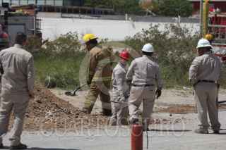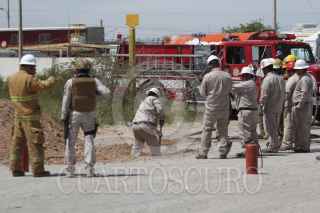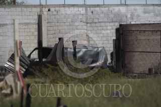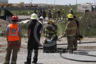 CIUDAD JUÁREZ, CHIHUAHUA, 31MARZO2020.- Se registró un incendio en un predio en la colonia Granjas Polo Gamboa provocado por la extracción ilegal de hidrocarburo de ducto de Pemex, bomberos y personal de Pemex se unieron para sofocar el fuego. En el lugar fueron localizaron dos vehículos; una van y una unidad de transporte, además de 10 bidones con capacidad de mil litros cada uno y un remolque tipo plataforma, con el que se supone transportaban la gasolina robada. Efrén Matamoros Barraza, titular de Protección Civil, dijo que no es la primera ocasión que ubican una toma clandestina e intensificarán las revisiones para detectar más casos de este tipo. Pese a que había viviendas aledañas al terreno, ninguna resultó con afectaciones por el fuego, declaró. FOTO: NACHO RUIZ/CUARTOSCURO.COM