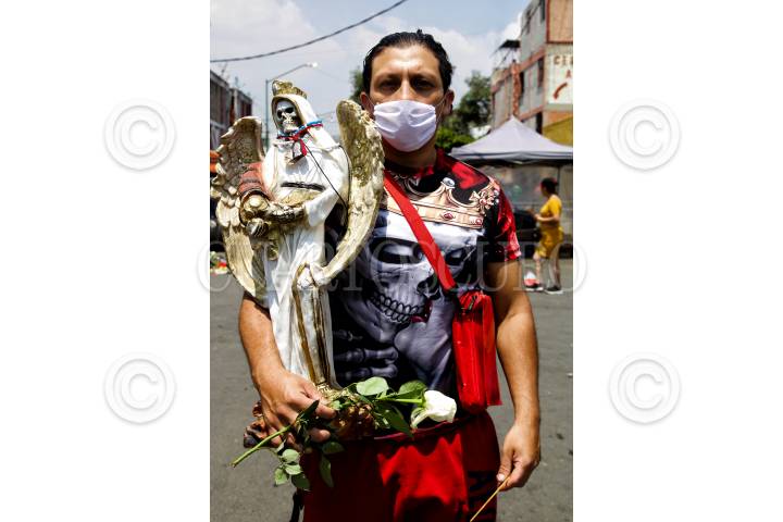 CIUDAD DE MÉXICO, 01ABRIL2020.- Pese a las recomendaciones de la Secretaría de Salud de quedarse en casa, decenas de creyentes de la Santa Muerte se congregaron en la calle Alfarería en Tepito, donde ya es tradición ir el primero de cada mes. FOTO: ANDREA MURCIA/CUARTOSCURO.COM