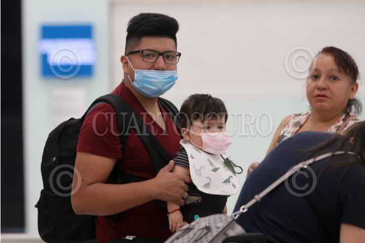 CIUDAD DE MÉXICO, 02ABRIL2020.- El Aeropuerto Internacional de la Ciudad de México (AICM) presenta poca afluencia de pasajeros. La mayoría de los vuelos han sido cancelados y decenas de personas que transitan en el lugar utilizan cubrebocas y guantes para evitar el posible contagio del Covid-19. FOTO: GRACIELA LÓPEZ /CUARTOSCURO.COM