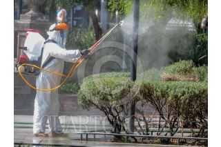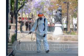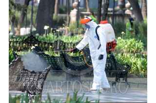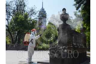 CIUDAD DE MÉXICO, 03ABRIL2020.- Trabajadores realizan la sanitización de la Alameda Central para evitar la extinción del contagio del covid-19. FOTO: ARMANDO MONROY /CUARTOSCURO.COM