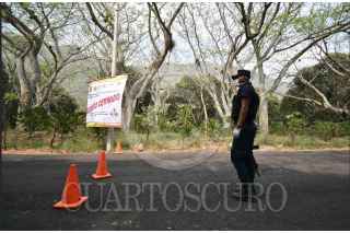 XALAPA, VERACRUZ, 03ABRIL2020.- Como parte de medida preventiva ante la contingencia por el coronavirus el ayuntamiento de Jalcomulco blindó la entrada al municipio. En una desviación se lee un letrero que dice “Jalcomulco cerrado” y advierte el retén donde se encuentran elementos de la policía evitando el paso a personas que no sean habitantes del lugar. No se permite acceso a visitantes. FOTO: YERANIA ROLÓN /CUARTOSCURO. COM