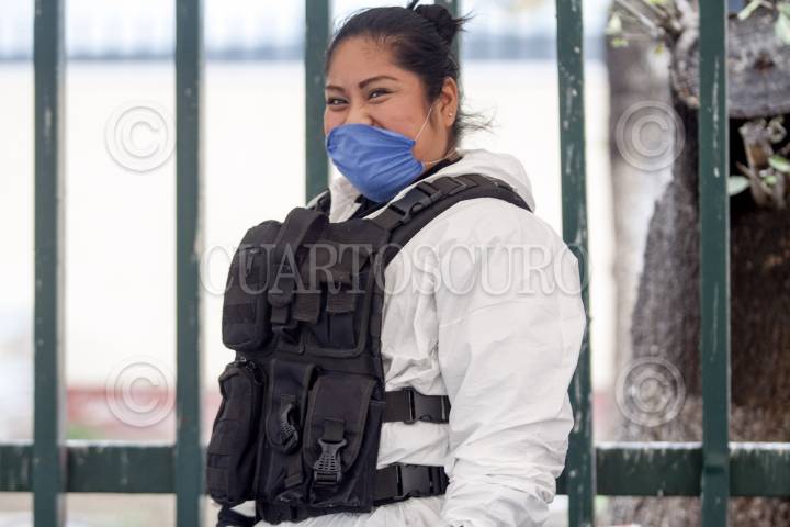 APODACA, NUEVO LEÓN, 05ABRIL2020.- Policía del municipio de Apodaca, opta por llevar trajes especiales debajo del equipo de seguridad para resguardar las entradas y salidas de posibles pacientes contagiados con Covid-19. FOTO: GABRIELA PÉREZ MONTIEL / CUARTOSCURO.COM
